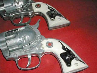 | Again, same Cowboysleft side view. The Colt 45 Peacemaker was the "Quintessential Western Gun" and so most of the toy Cap Guns used it as their role model. We have a very nice view of the steer head grips here and the red star in the circle above them. |