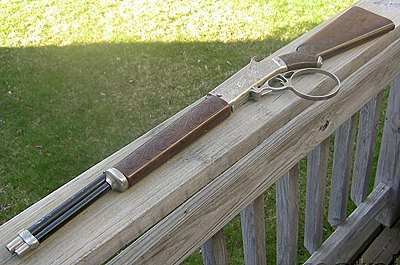 | The whole rifle. Well, it was basically a .30-30 with a special ring so that you could "throw it down" towards the ground (swivel it) and when it came back up, it was cocked. Probably nobody even noticed that with this configuration on the cocking handle, it would also go off immediately. Sort of like most people don't know that gunslingers only had 5 bullets in their 6-shooters. Unless you wanted to shoot yourself in the foot when you hit a bump. Photo thanks to Mike Tilbrook |