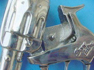 so that you can see where the caps belong. I'm not really completely aware if this nickel plating is original or whether these Cap Guns were refurbished and then re-plated. However, it doesn't really matter, since I don't own them. If I did, then I would probably have them locked in a vault! Cap Guns are a good investment, as the collectors are only gaining in number, but the guns remain elusiveespecially the high-quality ones. Photo thanks to Doug Hamilton |