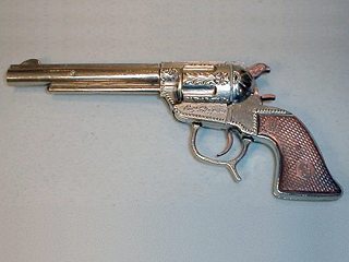 | Same gun, left side view. When you consider that this "Cap Gun" has a release and will hold caps, it is quite strange that it would at all, considering that it won't actually fire them. Maybe you could hold up a sign that said, "Bang!" Then the Bad Guy would hold up a sign that said, "You got me pard." Photo thanks to David Denton |