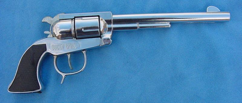 Notice that from the right side, this Cap Gun is labeled "BUCK'N BRONC." This Cap Gun looks so good that it almost looks like it has been polished down with rouge and then re-chromed.