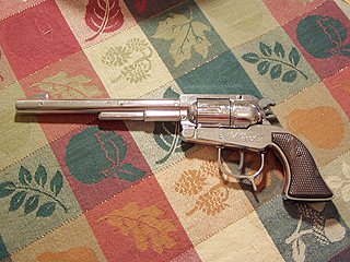 owned this Cap Gun. What do you think? But he would have been proud to. The chrome on this one is flawless as I said and you will notice the extreme "Buntline"-type length of this gun. Quality examples like command the highest prices and the really serious collects covet them! Photo thanks to Michael Sheehan |