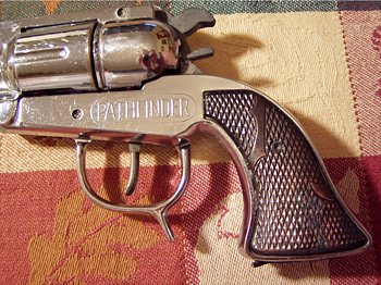 in this photo. I hope you will forgive me for the photo-editing on this grip, but in almost all cases I feel that you have the right to see what the original guns looked like when they left the factory. And this Cap Gun was such high quality, and it only needed one bit of "love" so what the heck? The chrome is so shiny that you can partially see Michael in the reflection, taking the photo. Photo thanks to Michael Sheehan |
